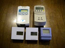 このエコワットより精度のよい写真上段右のワットチェッカー、そして今回いただいた上段左のワットアワーメーターが実験に加わります。 |