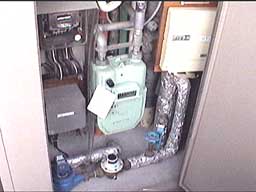 さて、この写真はおな じみのガス メーターです。 ガスメーターは、その名の通りガスの使用量を計測する機器で、最近では自信などの災害時に自動的にガス供給を停止する機構が内蔵され安全 性が増しております。 私の住む大阪市では13Aと言う都市ガスが供給されており、この他に12Aとかその他多種(7種 類:13A,12A,6A,5C,L1,L2,L3...2010年には13Aに統一予定)のガスが存在します。 |