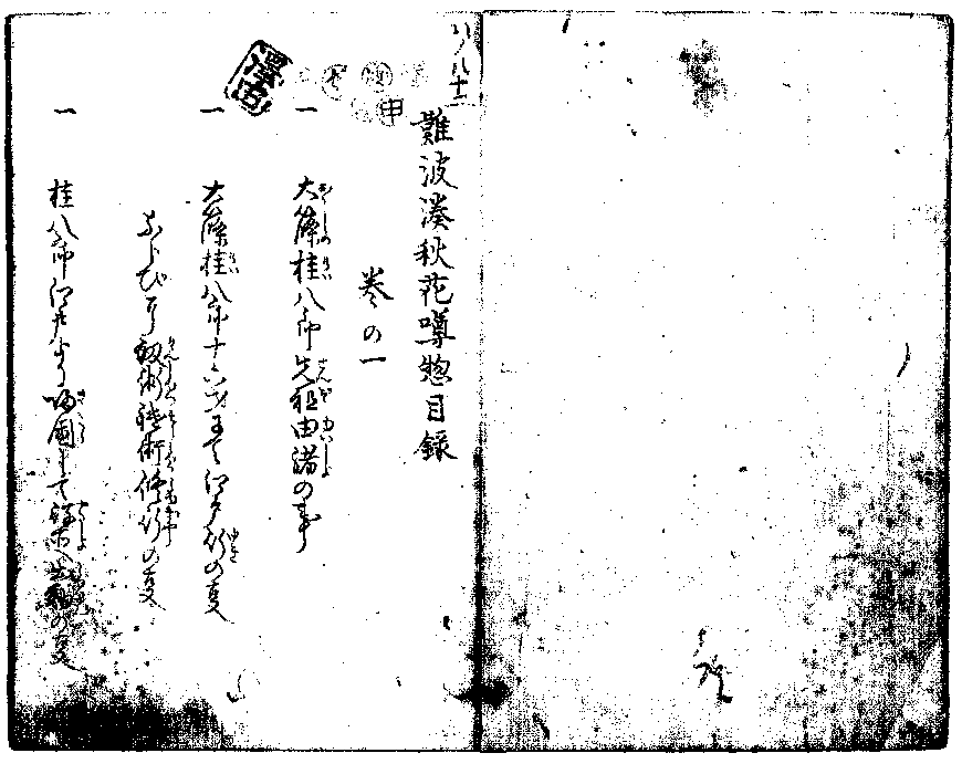 難波湊秋花噂惣目録 巻の一 おゝしのけい せんぞゆいしよ 一大篠桂八郎先祖由緒の事 けい ゆき 一大篠桂八郎十六才にて江戸行の事 けんしゆつそうしゆつしゆぎやう ならびに剣術鑓術修行の事 きこく やくしよ しゆつきん 一桂八郎江戸より帰国して役所へ出勤の事」(目録一オ)