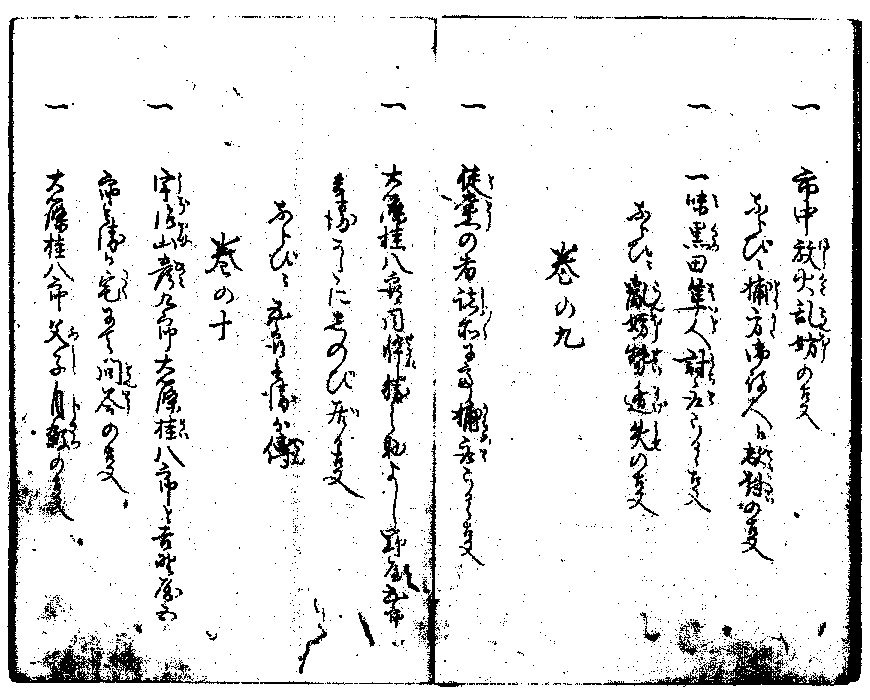 ほうくわらんほう 一市中放火乱妨の事 とりかた てきたい ならびニ捕方御役人江敵対の事 み はいと うちと 一一味黒田隼人討取らるゝ事 らんほうせいにげうせ ならひニ乱妨勢遁失の事 巻の九 ととう しよ/\ からめと 一徒党の者諸所にて捕取らるゝ事」(目録三ウ) せがれ 一大篠桂八郎同忰勝之助よし野屋五郎 い 兵衛かたにしのび居る事 でん ならびニ五郎兵衛が伝 巻の十 うじやまひこ けい 一宇治山彦九郎大篠桂八郎と吉野屋五 たく もんとう 郎兵衛か宅にて問答の事 ふ し じさつ 一大篠桂八郎父子自殺の事」(目録四オ)