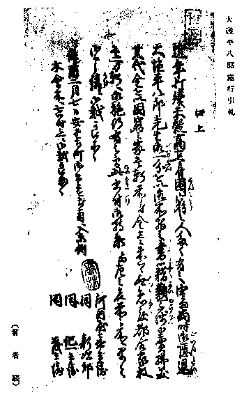 郎両人に命じ、夜中に之を摺らしめた、檄文は西ノ内美濃紙とも
