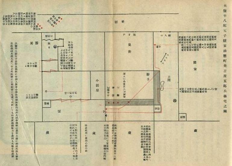 追手の面々は搦手の固がつきたりと見るや、一同美吉屋宅へ乗込