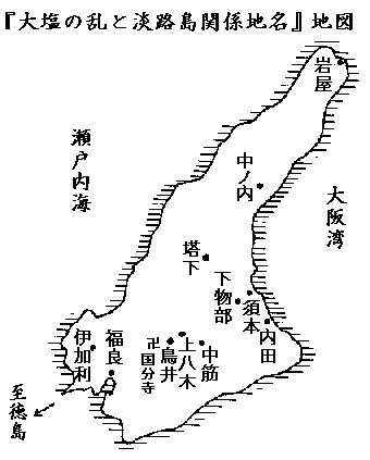 情報の伝播は、下物部村(現在の洲本市)組頭庄屋・佐野助作の『大塩一件聞調と手配』の見出しで記されている御用控によって知る事が出来る。