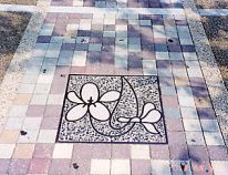 「花のみち」に埋め込まれてる、宝塚を象徴する「すみれの花」のレリーフ(右)。