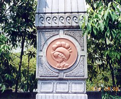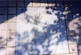 玄関前のモニュメント(左)とキャラクターの手形、足型(右)です。